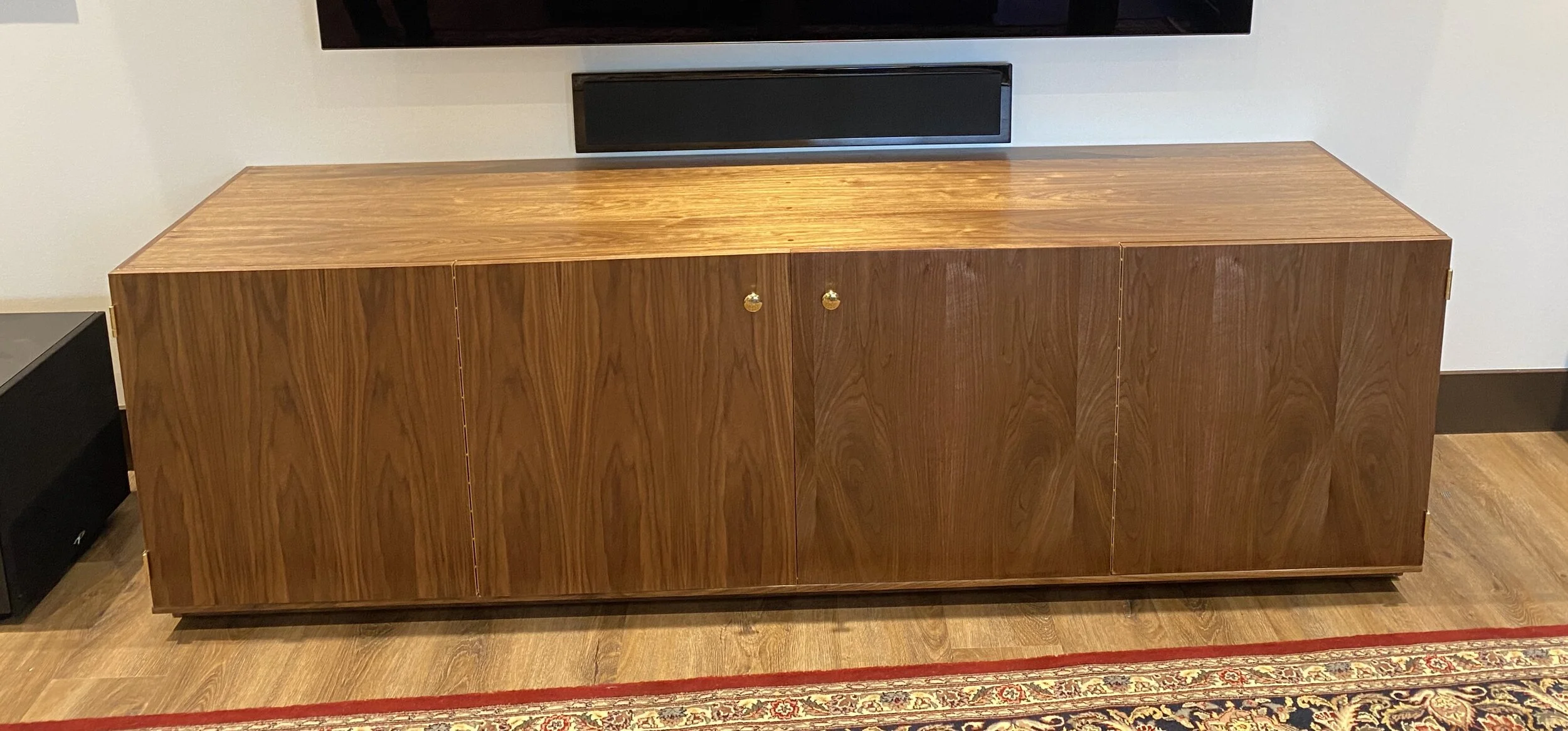 Walnut book shelves sitting above lower cabinets featuring sliding doors and fully adjustable shelving.