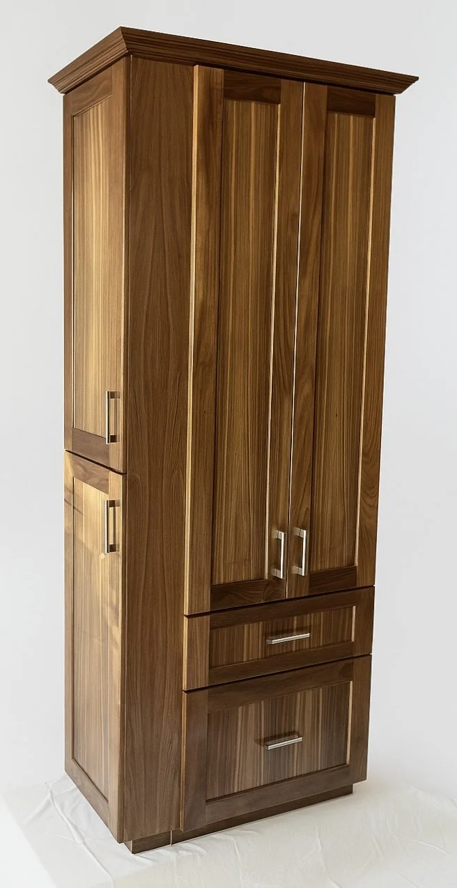 Walnut cabinet with pulldown shelf hardware and narrow side access shelving on the left side.